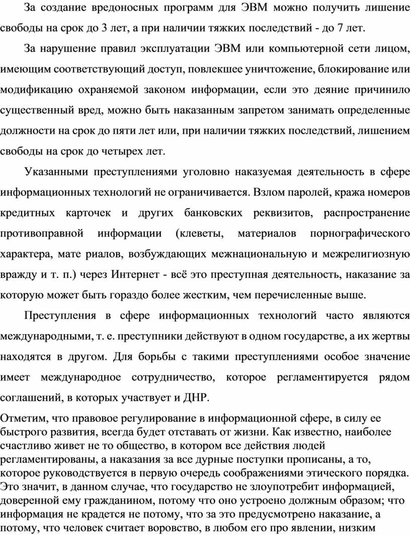 Нарушения законов в сфере информации предусматривают как гражданско-правовую, так и уголовную ответственность. В Уголовный кодекс ДНР внесен раздел «Преступления в сфере компьютерной информации». Он определил меру наказания за некоторые виды преступлений, ставших, к сожалению, распространенными.