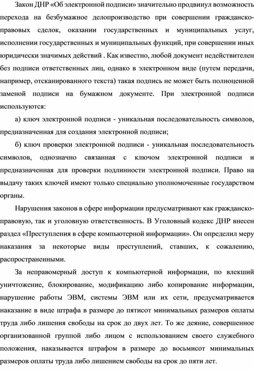 Закон ДНР «Об электронной подписи» значительно продвинул возможность перехода на безбумажное делопроизводство при совершении гражданско-правовых сделок, оказании государственных и муниципальных услуг, исполнении государственных и муниципальных функций, при совершении иных юридически значимых действий . Как известно, любой документ недействителен без подписи ответственных лиц, однако в электронном виде (путем передачи, например, отсканированного текста) такая подпись не может быть полноценной заменой подписи на бумажном документе. При электронной подписи используются: