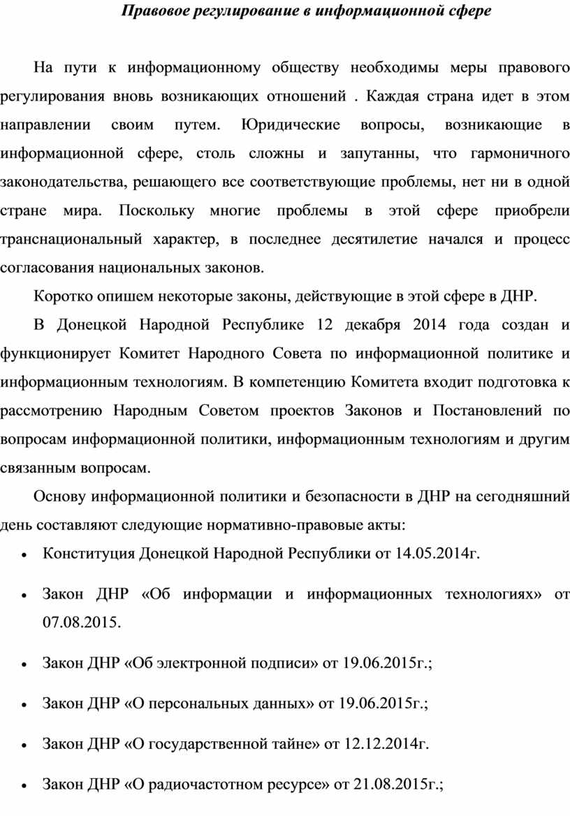 Правовое регулирование в информационной сфере является новой и сложной задачей для государства. В ДНР существует ряд законов в этой области |