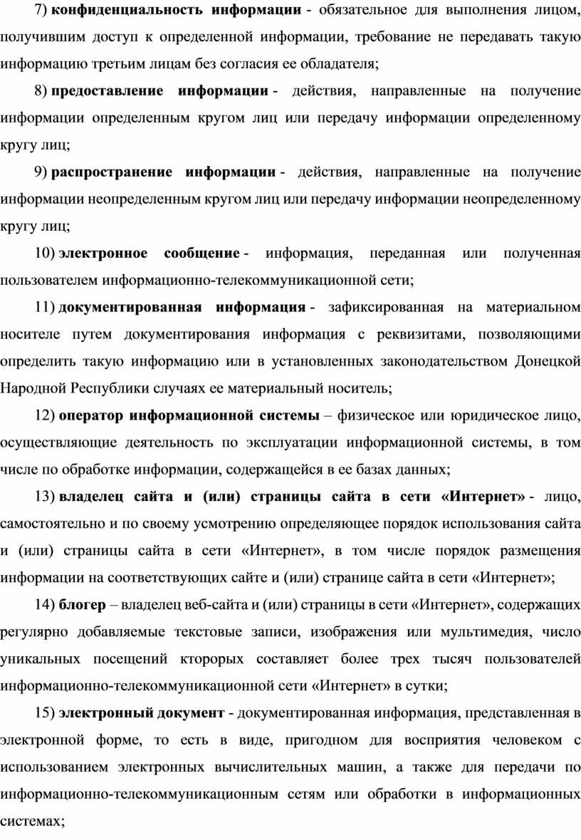 11) документированная информация - зафиксированная на материальном носителе путем документирования информация с реквизитами, позволяющими определить такую информацию или в установленных законодательством Донецкой Народной Республики случаях ее материальный носитель;