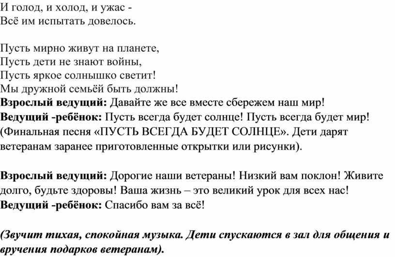 Ведущий -ребёнок: Мы знаем, что ваше детство было совсем не таким, как наше. Оно было опалено войной. Вы рано повзрослели, работали наравне со взрослыми и мечтали только об одном – о мире.