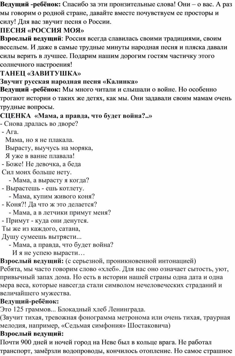 Ведущий -ребёнок: Мы много читали и слышали о войне. Но особенно трогают истории о таких же детях, как мы. Они задавали своим мамам очень трудные вопросы.