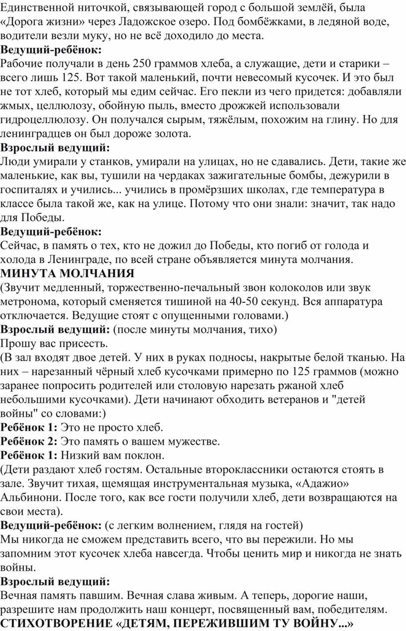(В зал входят двое детей. У них в руках подносы, накрытые белой тканью. На них – нарезанный чёрный хлеб кусочками примерно по 125 граммов (можно заранее попросить родителей или столовую нарезать ржаной хлеб небольшими кусочками). Дети начинают обходить ветеранов и "детей войны" со словами:)