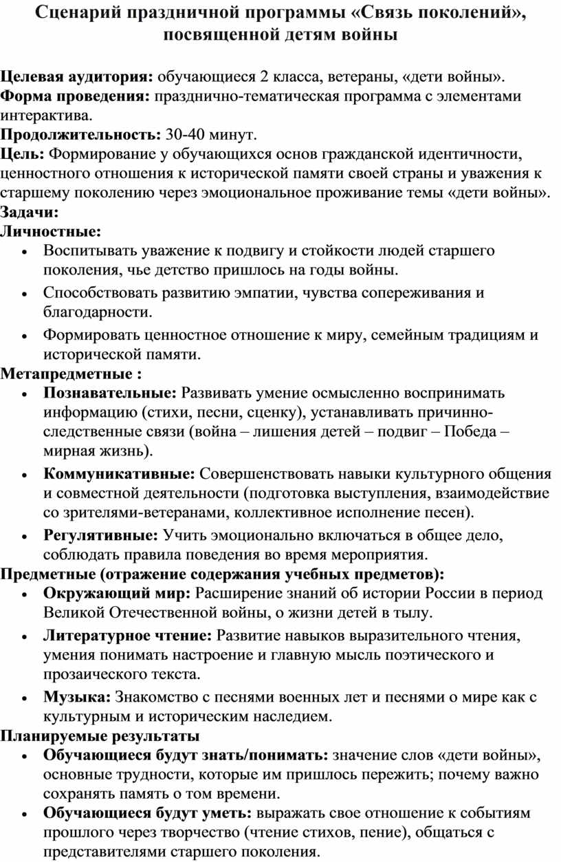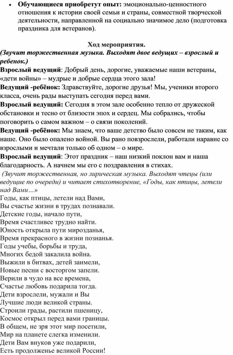 Цель: Формирование у обучающихся основ гражданской идентичности, ценностного отношения к исторической памяти своей страны и уважения к старшему поколению через эмоциональное проживание темы «дети войны».