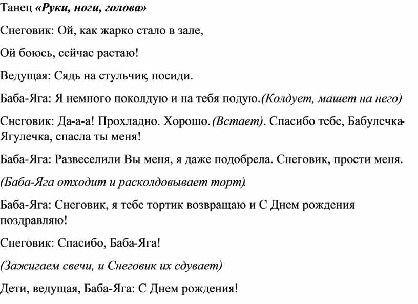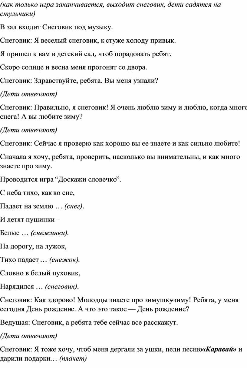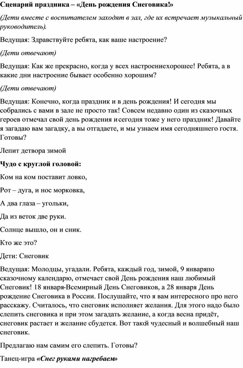 Снеговик: Как здорово! Молодцы знаете про зимушку-зиму! Ребята, у меня сегодня День рождение. А что это такое — День рождение?