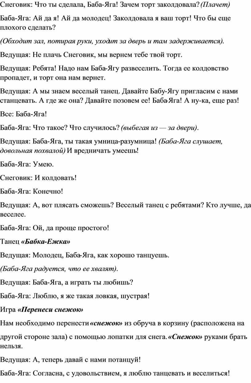 Ведущая: Ребята! Надо нам Баба-Ягу развеселить. Тогда ее колдовство пропадет, и торт она нам вернет.