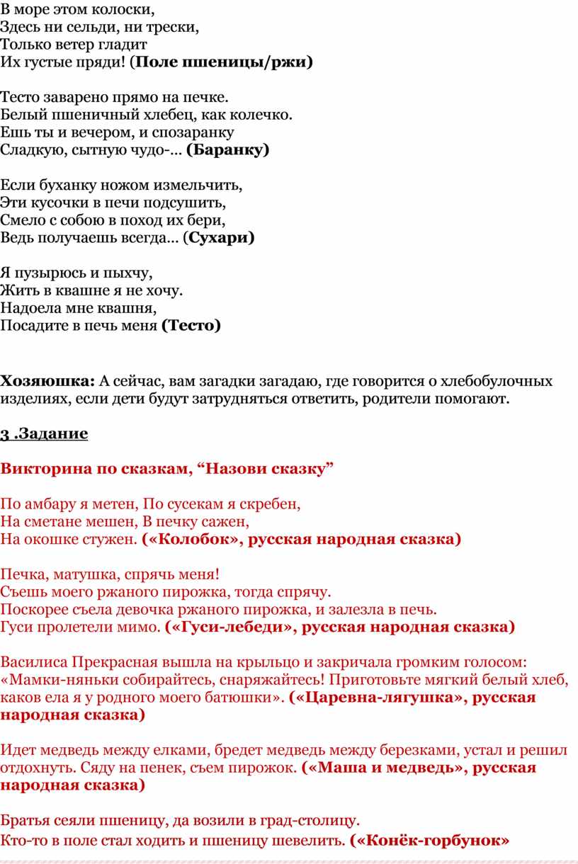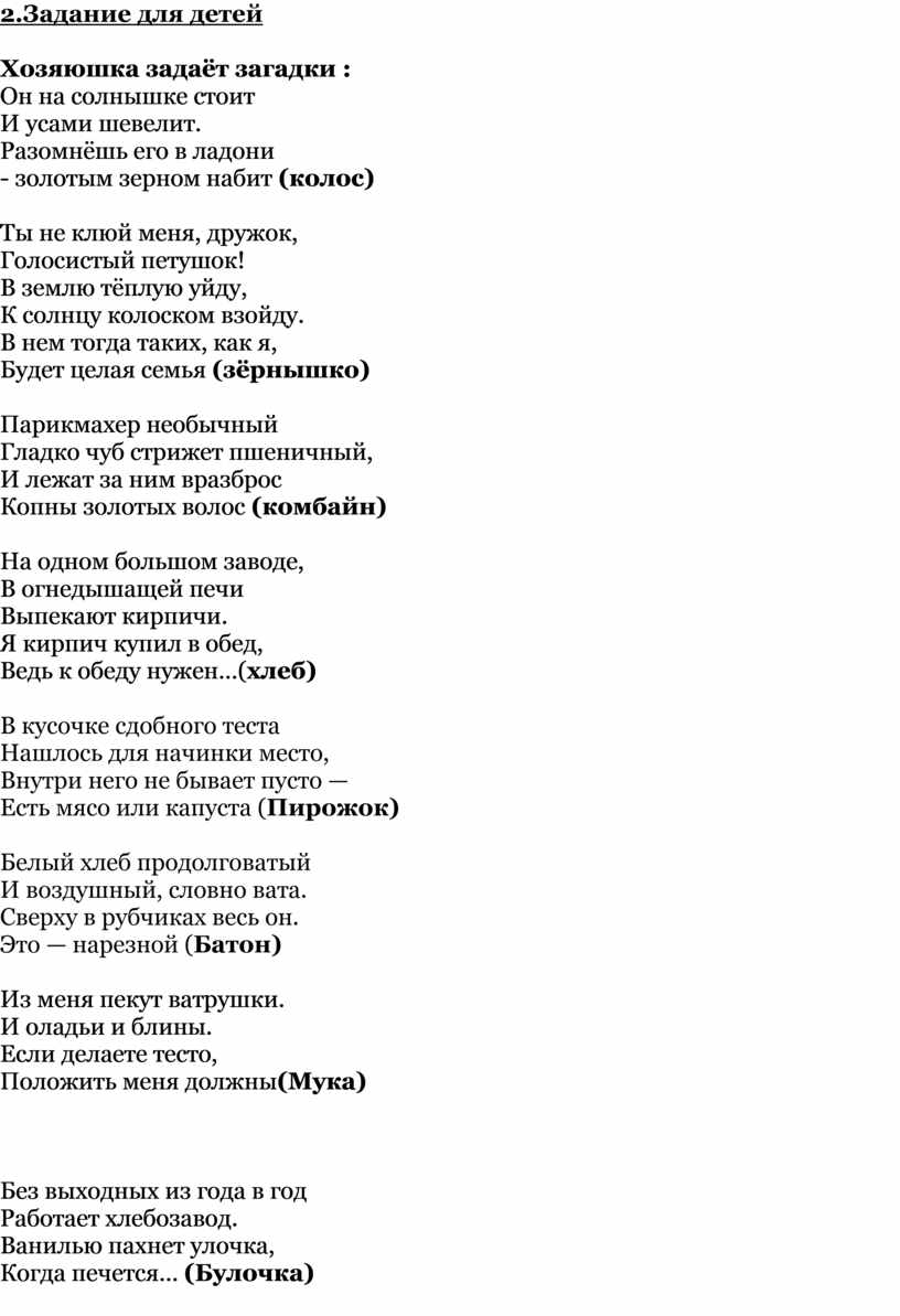 Хозяюшка: А сейчас, вам загадки загадаю, где говорится о хлебобулочных изделиях, если дети будут затрудняться ответить, родители помогают.