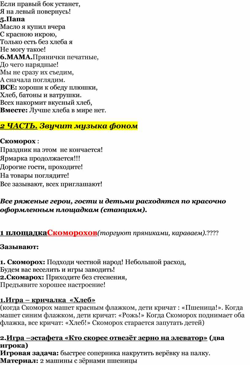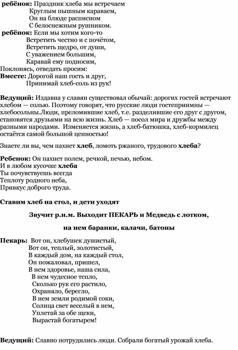 Доброго дня вам, уважаемые гости нашего праздника! Встретились мы с вами в пору багряную, осеннюю. В народе говорят: «Осень золотистая — хлебом колосистая!» Сегодня наш праздник посвящён хлебу! С давних времён, у русского народа, был обычай: как заканчивались осенние работы в саду, поле, убирали хлеб в закрома, на Руси устраивали весёлые ярмарки, пели и плясали, пекли пышные хлеба.