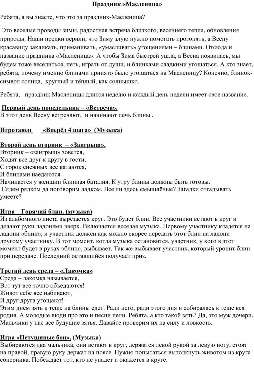 Это веселые проводы зимы, радостная встреча близкого, весеннего тепла, обновления природы. Наши предки верили, что Зиму злую нужно помогать прогонять, а Весну – красавицу закликать, приманивать, «умасливать» угощениями – блинами. Отсюда и название праздника «Масленица». А чтобы Зима быстрей ушла, а Весна появилась, мы будем тоже веселиться, петь, играть от души, и блинками сладкими угощаться. А кто знает, ребята, почему именно блинами принято было угощаться на Масленицу? Конечно, блинок-символ солнца, круглый и тёплый, как солнышко.