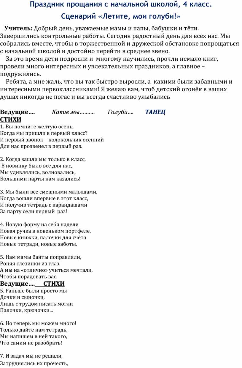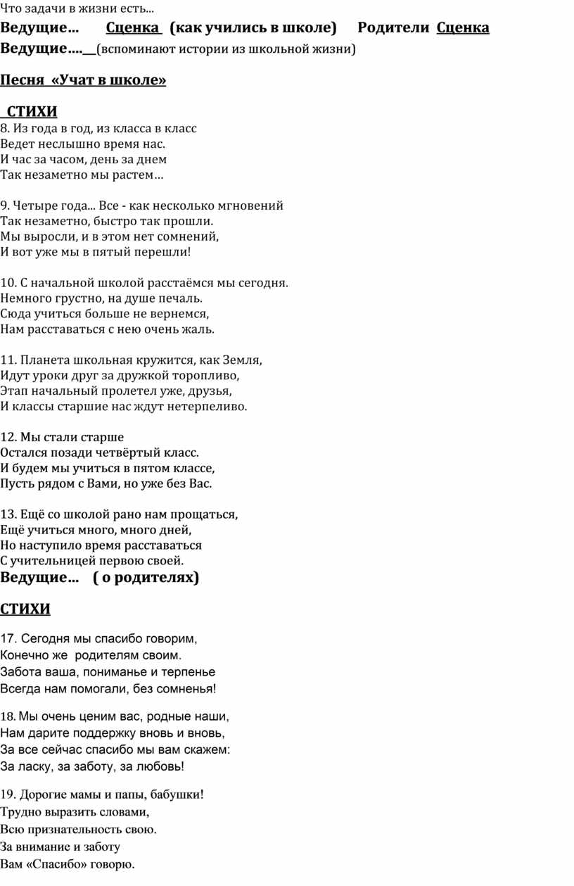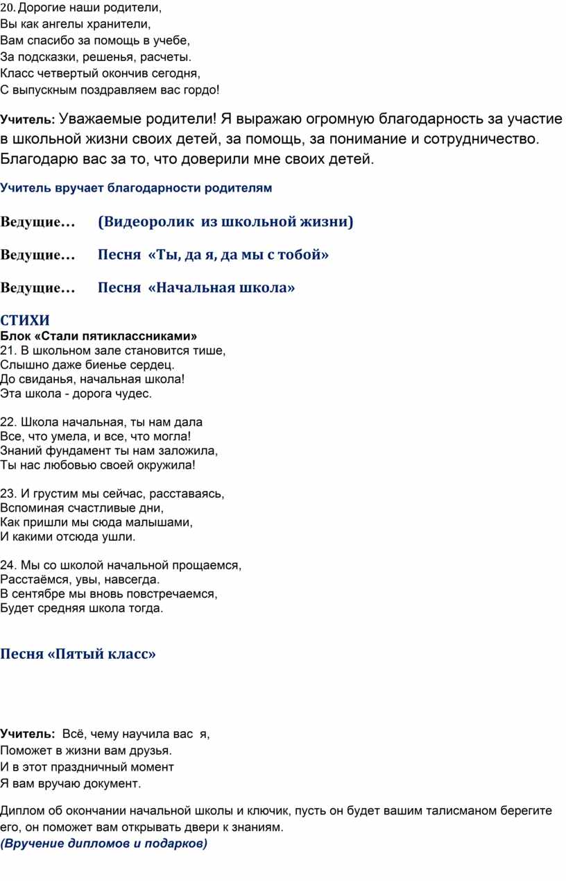 20. Дорогие наши родители, Вы как ангелы хранители, Вам спасибо за помощь в учебе, За подсказки, решенья, расчеты. Класс четвертый окончив сегодня, С выпускным поздравляем вас гордо!
