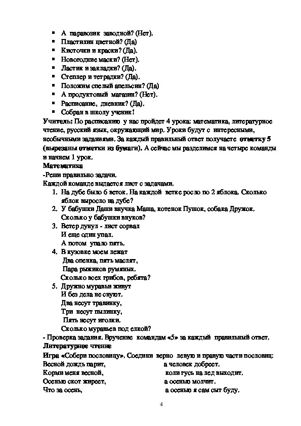 Учитель: По расписанию у нас пройдет 4 урока: математика, литературное