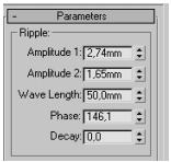 плоскости модификатор Noise (рис.26). Настроить его (рис.27). Далее применить к плоскости модификатор Ripple, настроить его таким образом, чтобы получился след от основания бокала (рис.28, 29).