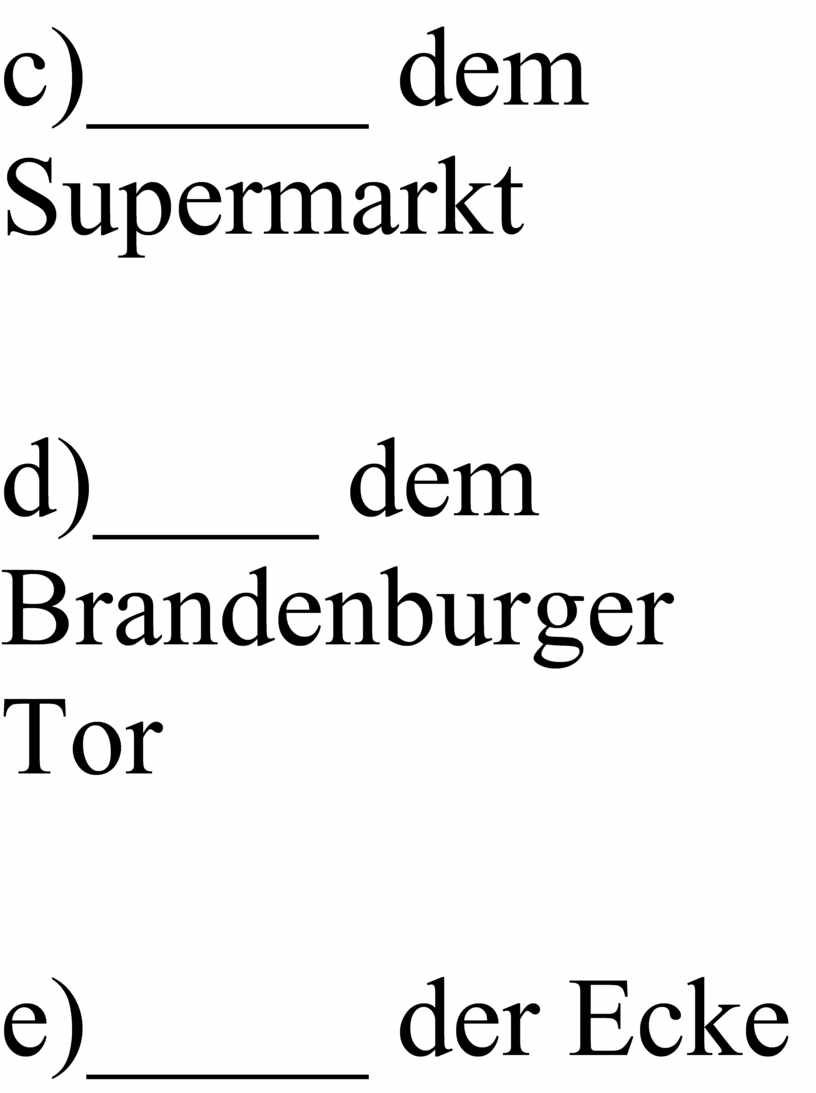 a) ____dem Marktplatz d)____ dem Brandenburger Tot g)_____ der Post