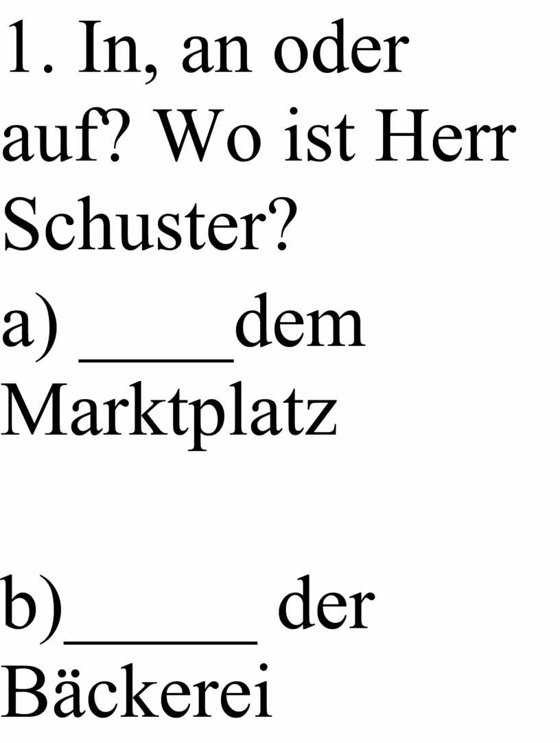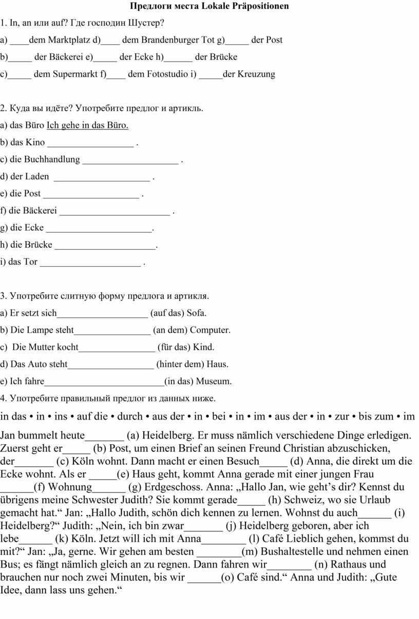 Jan bummelt heute_______ (a) Heidelberg. Er muss nämlich verschiedene Dinge erledigen. Zuerst geht er_____ (b) Post, um einen Brief an seinen Freund Christian abzuschicken, der_______ (c) Köln wohnt. Dann macht er einen Besuch_____ (d) Anna, die direkt um die Ecke wohnt. Als er _____(e) Haus geht, kommt Anna gerade mit einer jungen Frau ______(f) Wohnung______ (g) Erdgeschoss. Anna: „Hallo Jan, wie geht’s dir? Kennst du übrigens meine Schwester Judith? Sie kommt gerade_____ (h) Schweiz, wo sie Urlaub gemacht hat.“ Jan: „Hallo Judith, schön dich kennen zu lernen. Wohnst du auch______ (i) Heidelberg?“ Judith: „Nein, ich bin zwar_______ (j) Heidelberg geboren, aber ich lebe______ (k) Köln. Jetzt will ich mit Anna________ (l) Café Lieblich gehen, kommst du mit?“ Jan: „Ja, gerne. Wir gehen am besten ________(m) Bushaltestelle und nehmen einen Bus; es fängt nämlich gleich an zu regnen. Dann fahren wir________ (n) Rathaus und brauchen nur noch zwei Minuten, bis wir ______(o) Café sind.“ Anna und Judith: „Gute Idee, dann lass uns gehen.“
