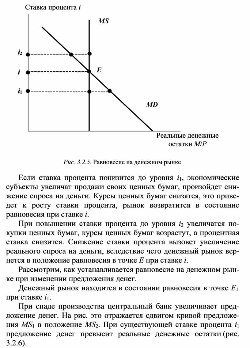 При повышении ставки процента до уровня i2 увеличатся по- купки ценных бумаг, курсы ценных бумаг возрастут, а процентная ставка снизится. Снижение ставки процента вызовет увеличение реального спроса на деньги, вследствие чего денежный рынок вер- нется в положение равновесия в точке Е при ставке i.