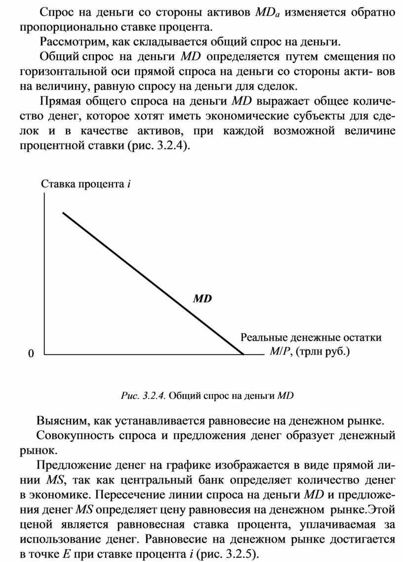 Прямая общего спроса на деньги MD выражает общее количе- ство денег, которое хотят иметь экономические субъекты для сде- лок и в качестве активов, при каждой возможной величине процентной ставки (рис. 3.2.4).
