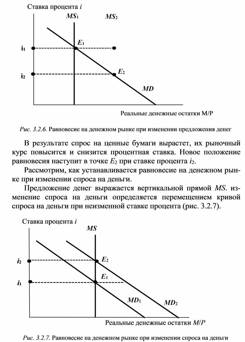 В результате спрос на ценные бумаги вырастет, их рыночный курс повысится и снизится процентная ставка. Новое положение равновесия наступит в точке Е2 при ставке процента i2.