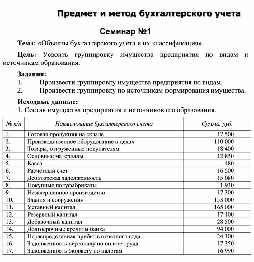 Цель: Усвоить группировку имущества предприятия по видам и источникам образования.