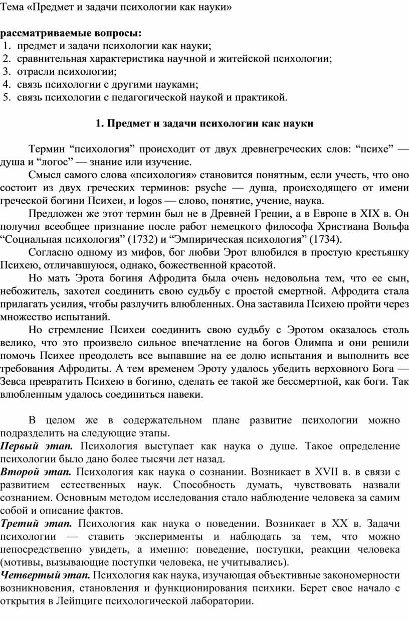 Изучение сущности и закономерностей развития психики человека и животных и составляет предмет научной психологии.
