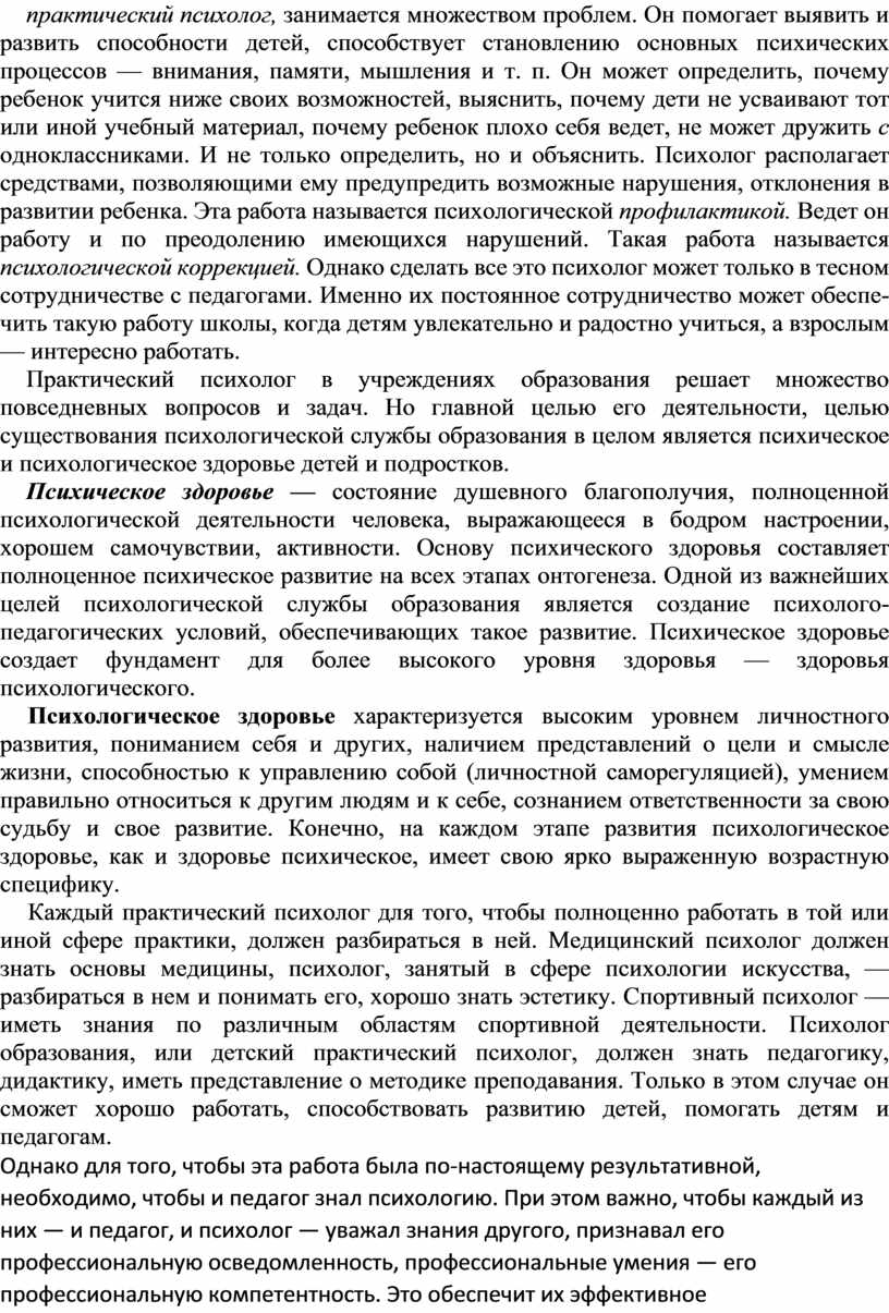 Психолог, работающий в детских садах, школах, колледжах, профессионально-технических училищах, детских домах и т.п. — педагог-психолог, или детский практический психолог, занимается множеством проблем. Он помогает выявить и развить способности детей, способствует становлению основных психических процессов — внимания, памяти, мышления и т. п. Он может определить, почему ребенок учится ниже своих возможностей, выяснить, почему дети не усваивают тот или иной учебный материал, почему ребенок плохо себя ведет, не может дружить с одноклассниками. И не только определить, но и объяснить. Психолог располагает средствами, позволяющими ему предупредить возможные нарушения, отклонения в развитии ребенка. Эта работа называется психологической профилактикой. Ведет он работу и по преодолению имеющихся нарушений. Такая работа называется психологической коррекцией. Однако сделать все это психолог может только в тесном сотрудничестве с педагогами. Именно их постоянное сотрудничество может обеспечить такую работу школы, когда детям увлекательно и радостно учиться, а взрослым — интересно работать.