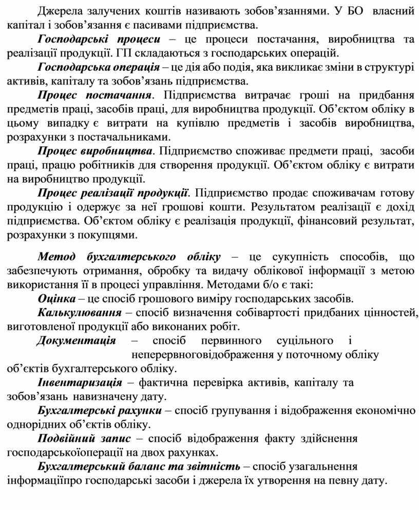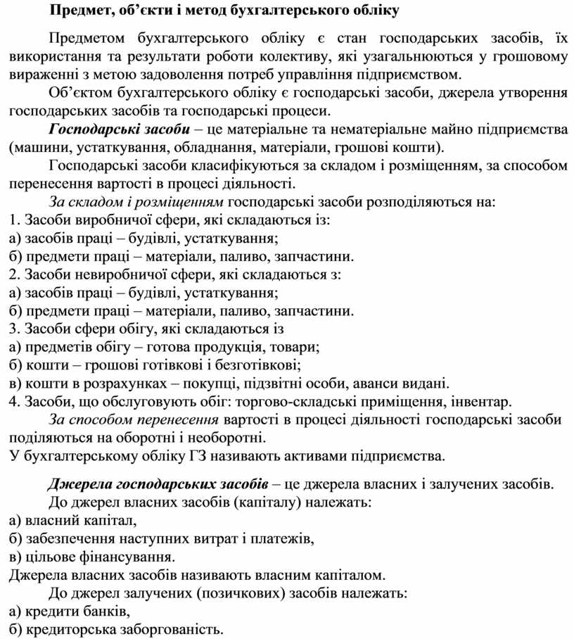 Об’єктом бухгалтерського обліку є господарські засоби, джерела утворення господарських засобів та господарські процеси.