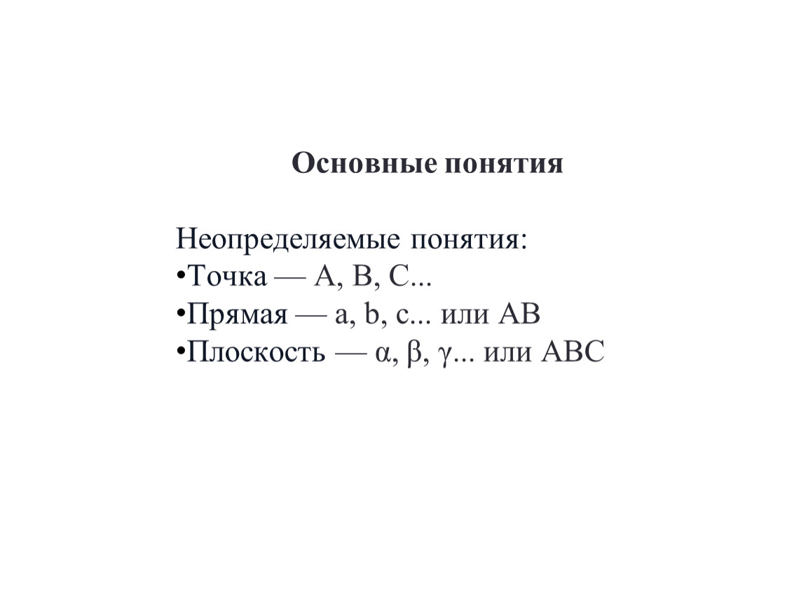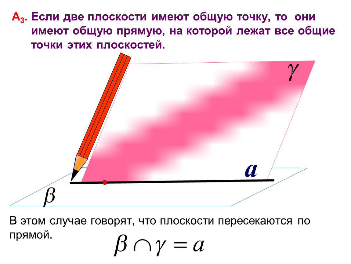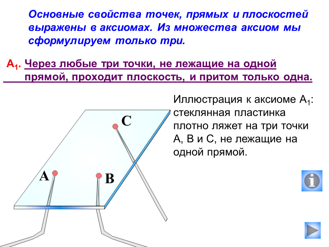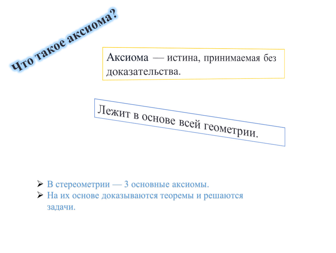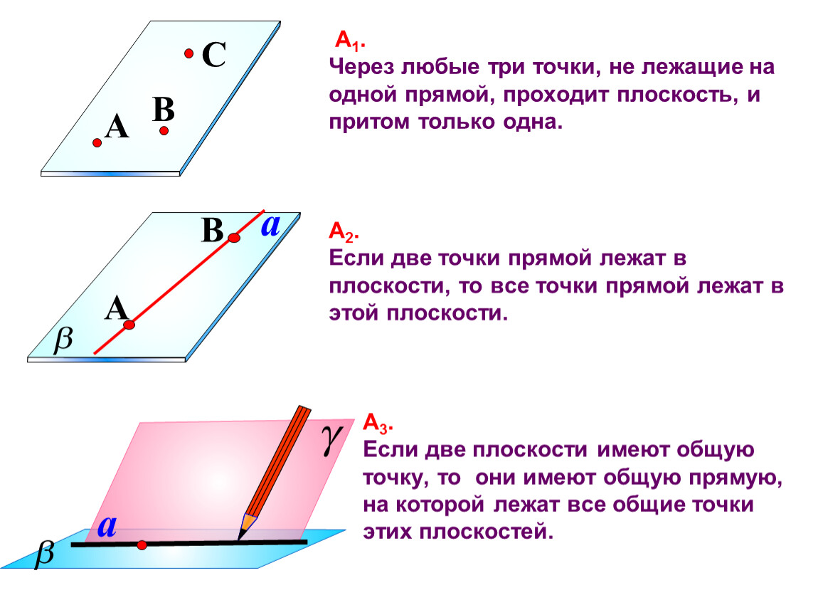 Основные свойства точек, прямых и плоскостей выражены в аксиомах. Из множества аксиом мы сформулируем только три.
