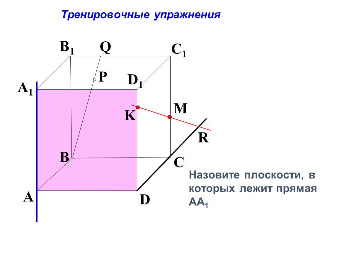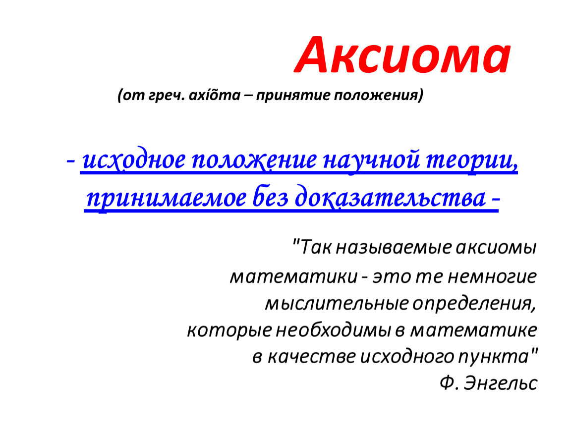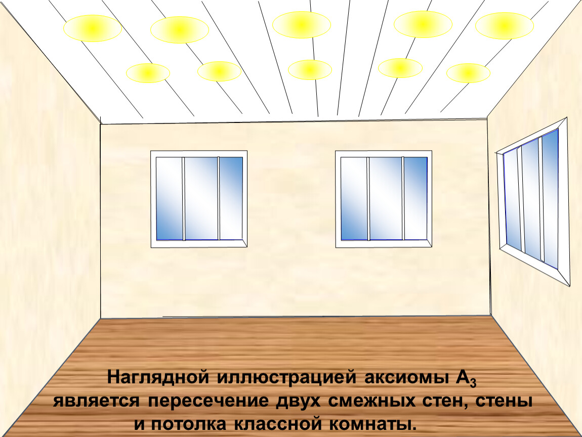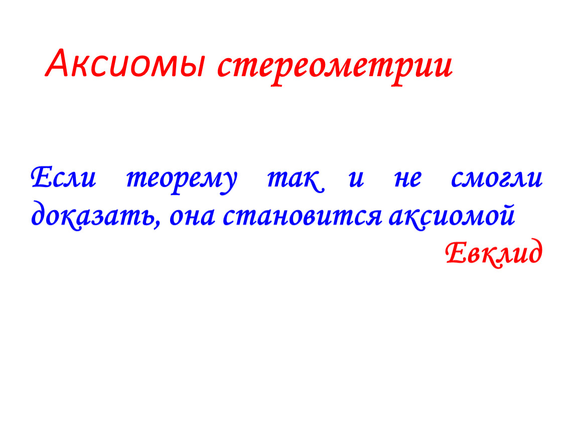 Основные свойства точек, прямых и плоскостей выражены в аксиомах. Из множества аксиом мы сформулируем только три.
