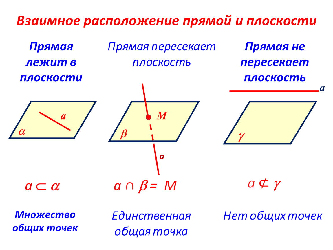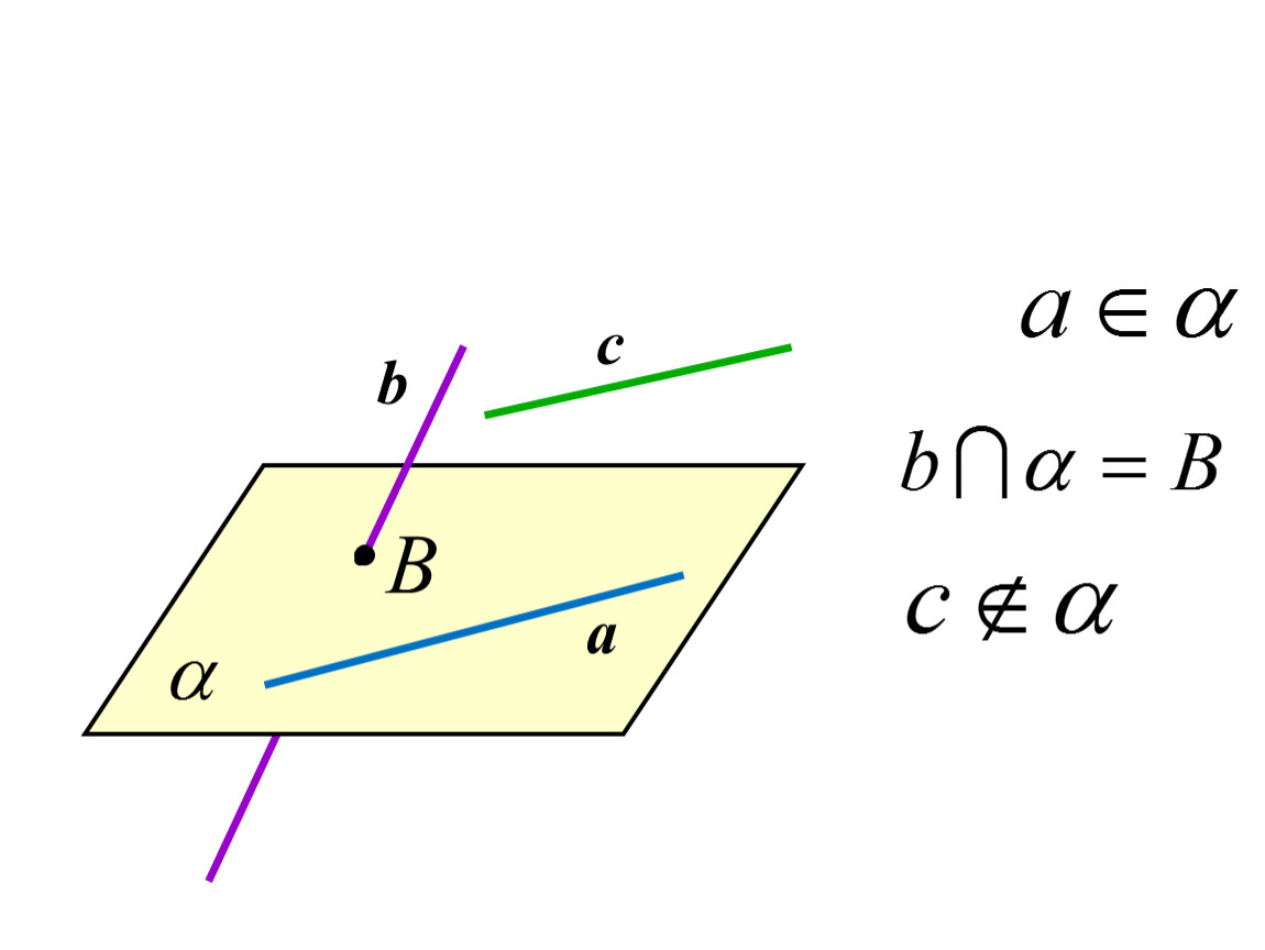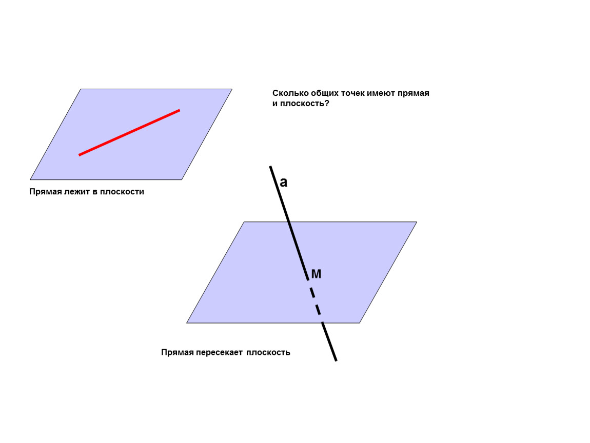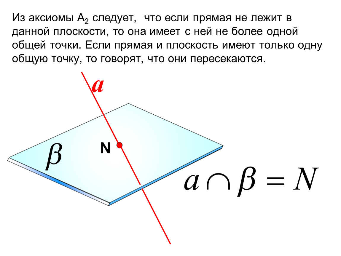 Из аксиомы А2 следует, что если прямая не лежит в данной плоскости, то она имеет с ней не более одной общей точки. Если прямая и плоскость имеют только одну общую точку, то говорят, что они пересекаются.