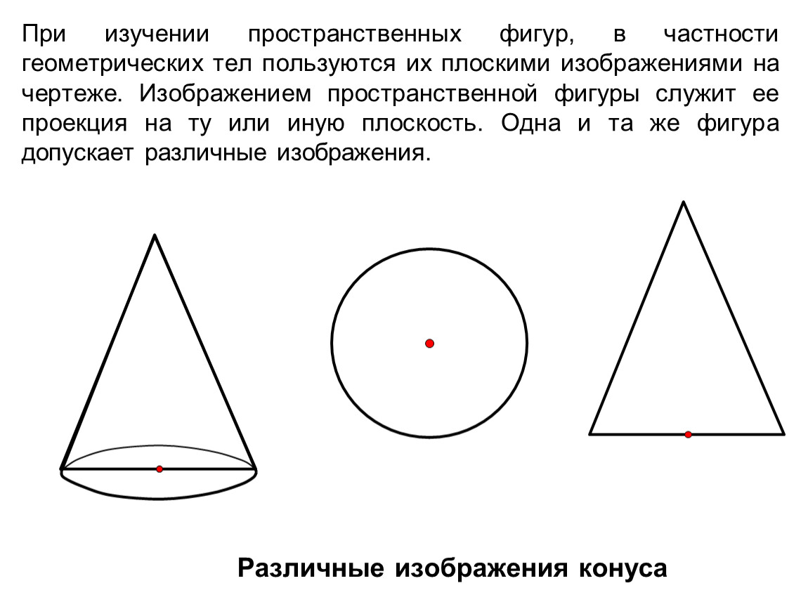 При изучении пространственных фигур, в частности геометрических тел пользуются их плоскими изображениями на чертеже. Изображением пространственной фигуры служит ее проекция на ту или иную плоскость. Одна и та же фигура допускает различные изображения.