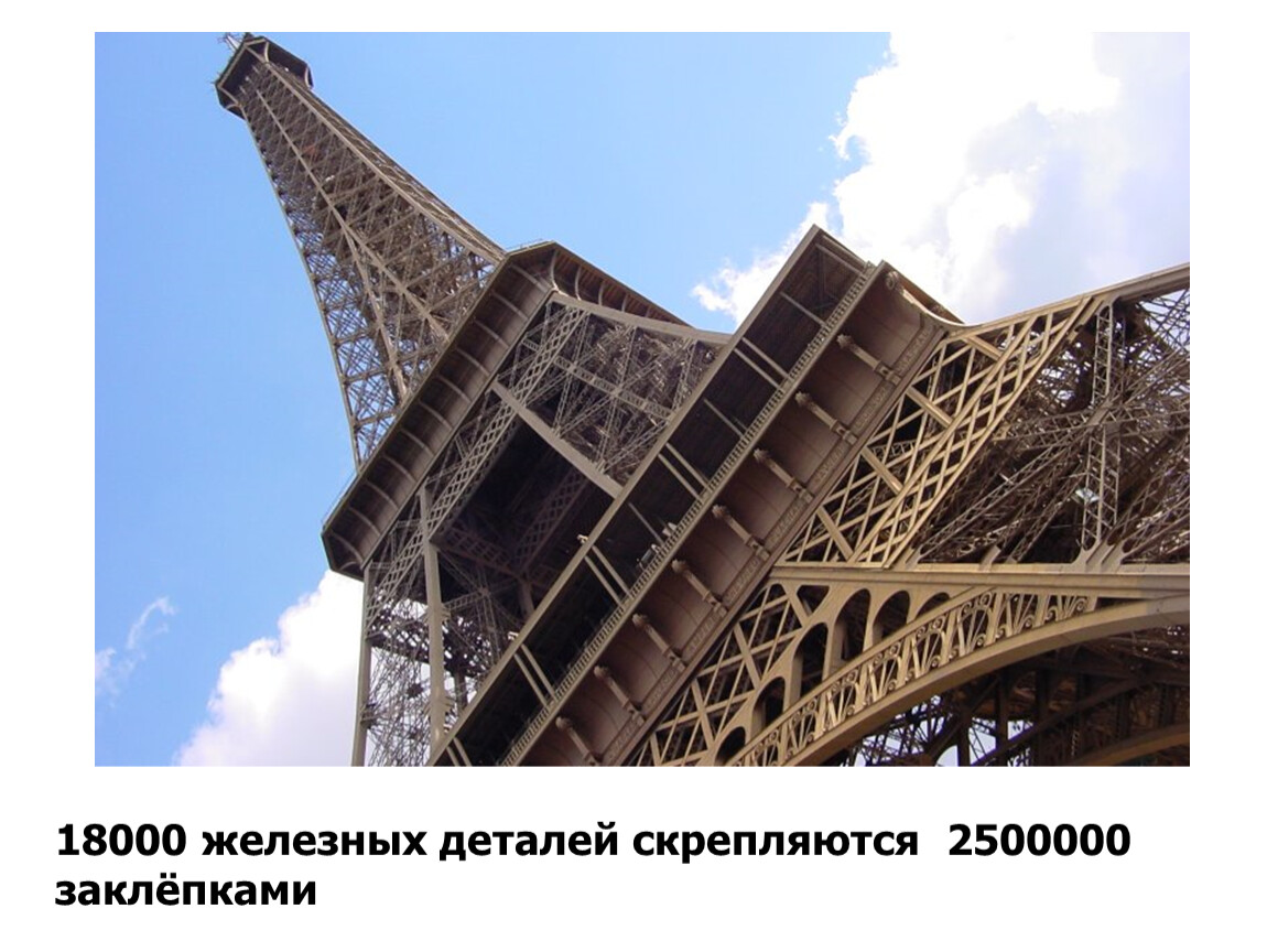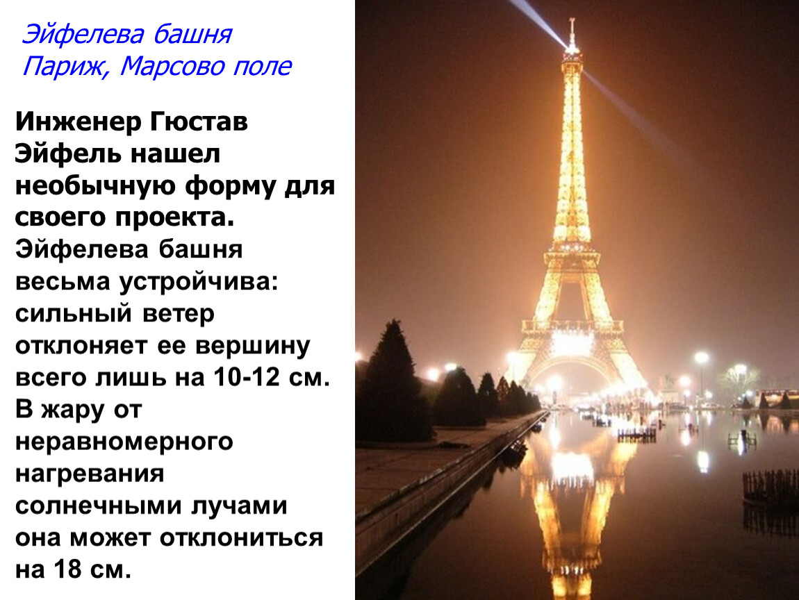 Эйфелева башня весьма устройчива: сильный ветер отклоняет ее вершину всего лишь на 10-12 см. В жару от неравномерного нагревания солнечными лучами она может отклониться на 18 см.
