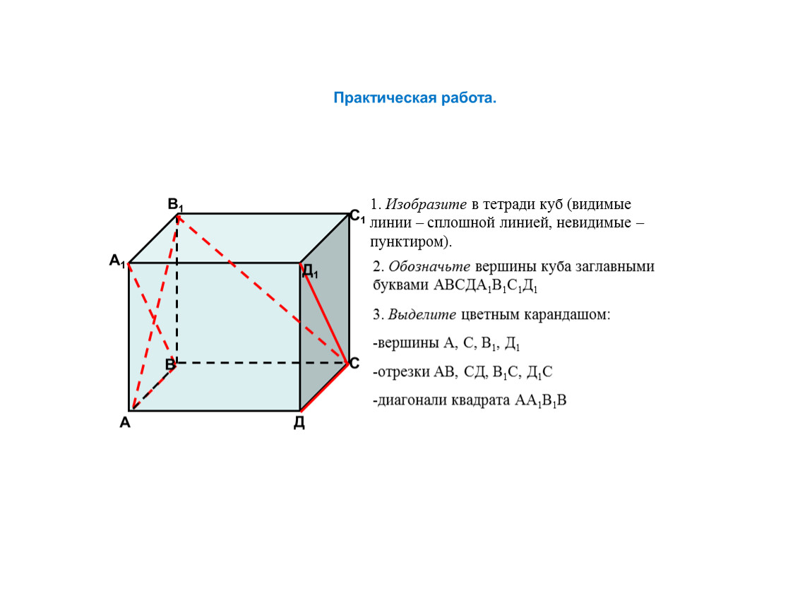 1. Изобразите в тетради куб (видимые линии – сплошной линией, невидимые – пунктиром).