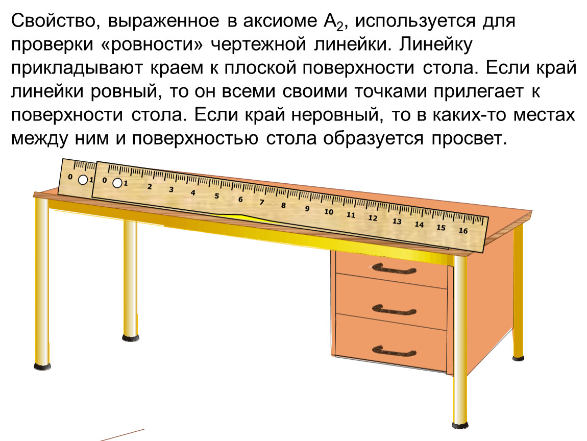 Свойство, выраженное в аксиоме А2, используется для проверки «ровности» чертежной линейки. Линейку прикладывают краем к плоской поверхности стола. Если край линейки ровный, то он всеми своими точками прилегает к поверхности стола. Если край неровный, то в каких-то местах между ним и поверхностью стола образуется просвет.