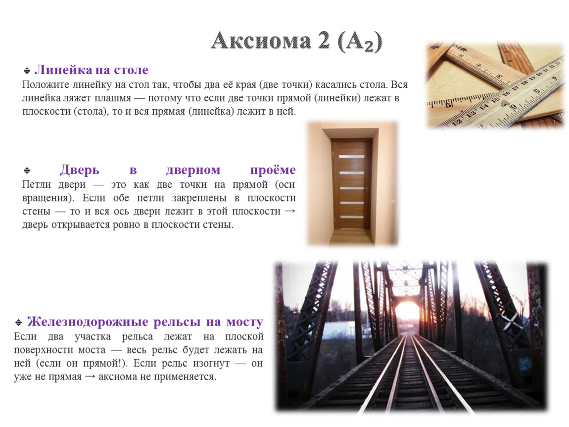🔹🔹 Железнодорожные рельсы на мостуЕсли два участка рельса лежат на плоской поверхности моста — весь рельс будет лежать на ней (если он прямой!). Если рельс изогнут — он уже не прямая → аксиома не применяется.