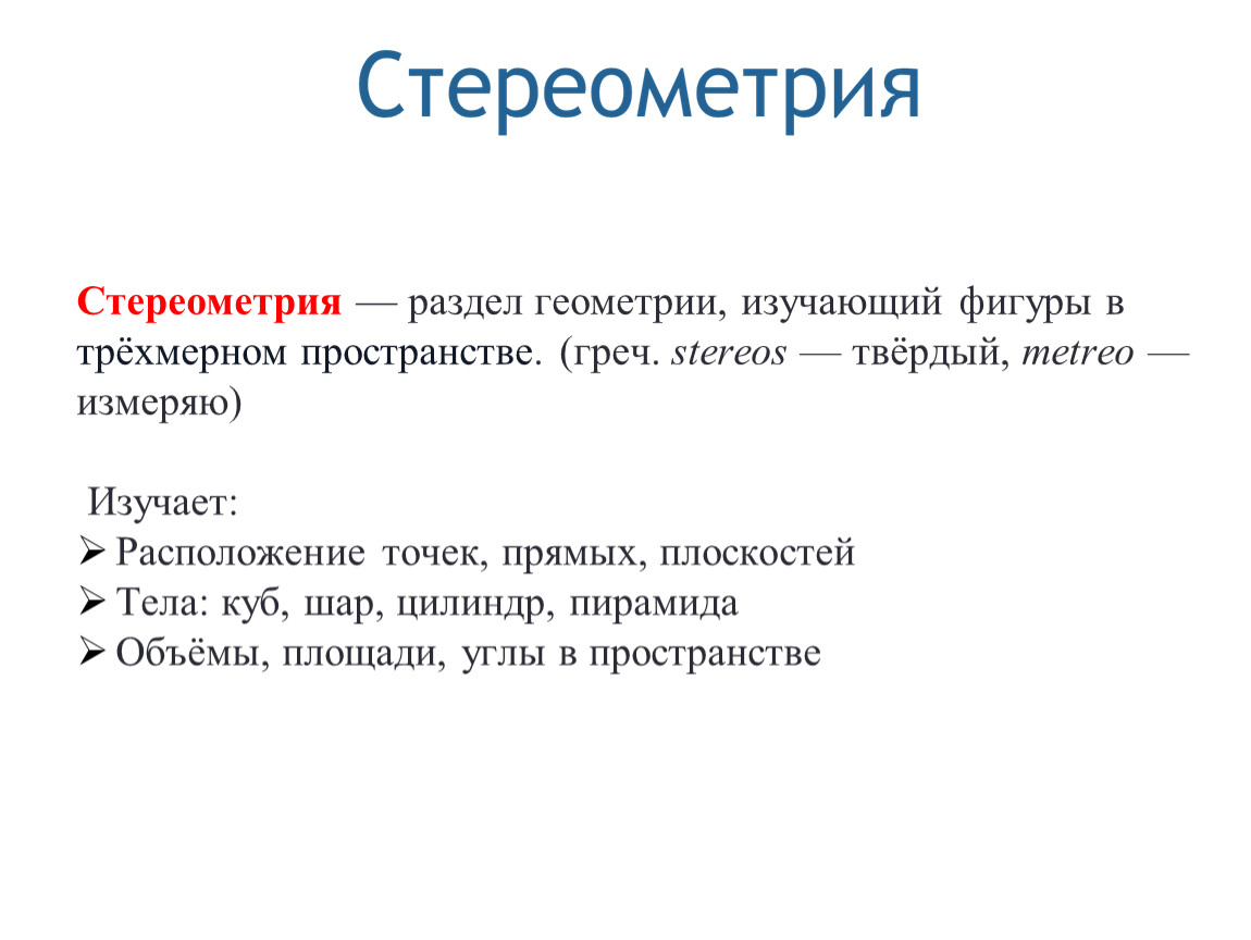 Стереометрия — раздел геометрии, изучающий фигуры в трёхмерном пространстве. (греч. stereos — твёрдый, metreo — измеряю)