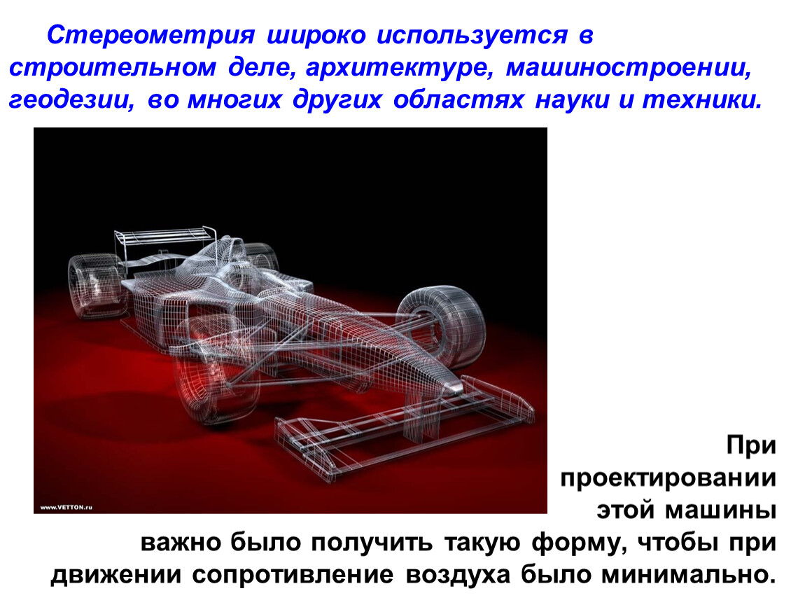 Стереометрия широко используется в строительном деле, архитектуре, машиностроении, геодезии, во многих других областях науки и техники.
