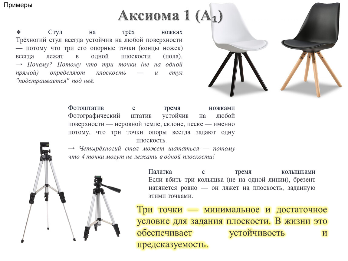🔹🔹 Стул на трёх ножкахТрёхногий стул всегда устойчив на любой поверхности — потому что три его опорные точки (концы ножек) всегда лежат в одной плоскости (пола).→ Почему? Потому что три точки (не на одной прямой) определяют плоскость — и стул "подстраивается" под неё.