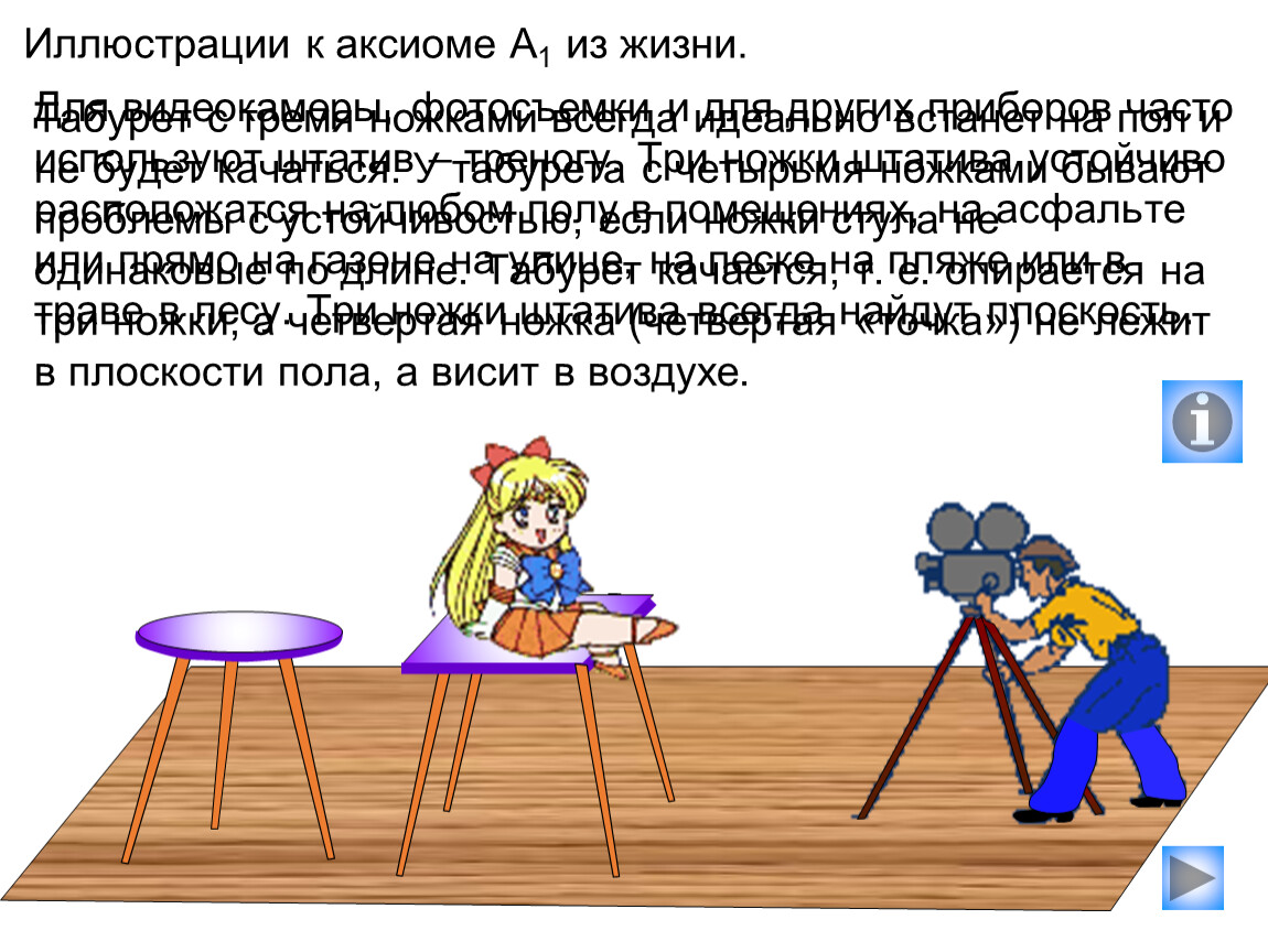 Фотоштатив с тремя ножкамиФотографический штатив устойчив на любой поверхности — неровной земле, склоне, песке — именно потому, что три точки опоры всегда задают одну плоскость.→ Четырёхногий стол может шататься — потому что 4 точки могут не лежать в одной плоскости!