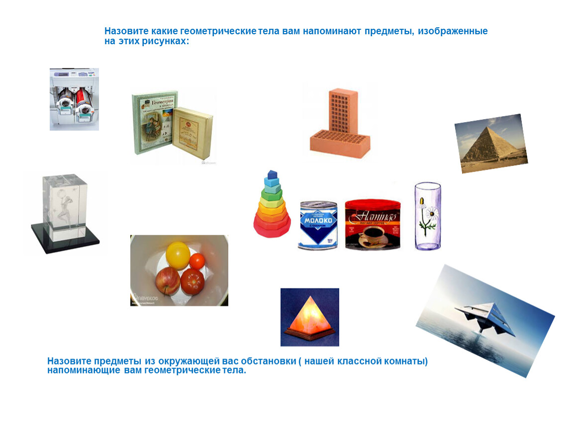 Назовите предметы из окружающей вас обстановки ( нашей классной комнаты) напоминающие вам геометрические тела.