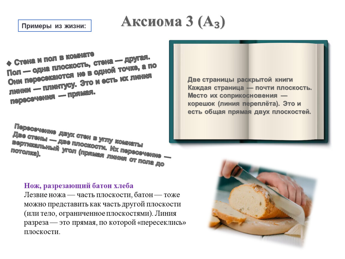Нож, разрезающий батон хлебаЛезвие ножа — часть плоскости, батон — тоже можно представить как часть другой плоскости (или тело, ограниченное плоскостями). Линия разреза — это прямая, по которой «пересеклись» плоскости.