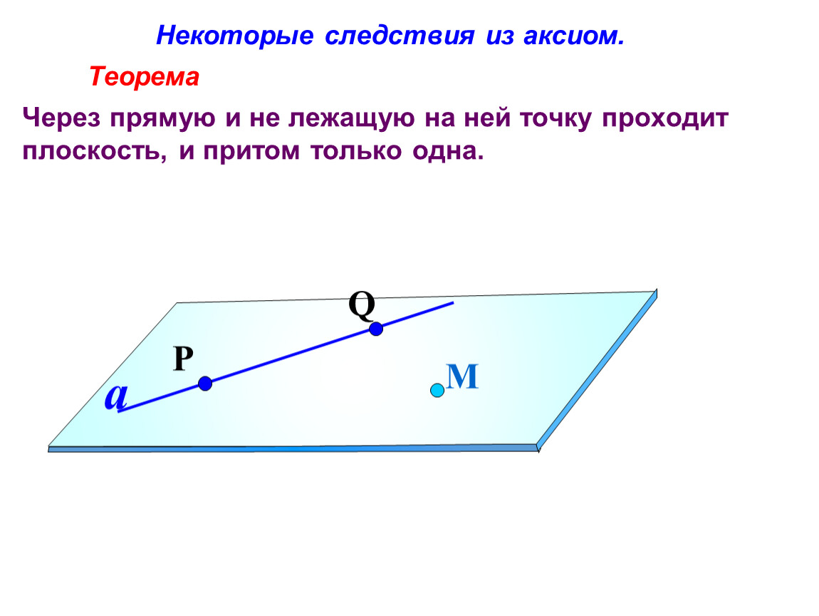 Через прямую и не лежащую на ней точку проходит плоскость, и притом только одна.