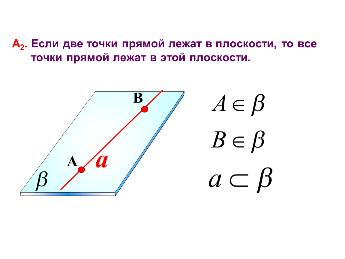 Если две точки прямой лежат в плоскости, то ВСЕ точки прямой лежат в этой плоскости.