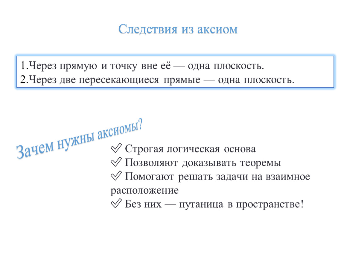 ✅ Строгая логическая основа✅ Позволяют доказывать теоремы✅ Помогают решать задачи на взаимное расположение✅ Без них — путаница в пространстве!