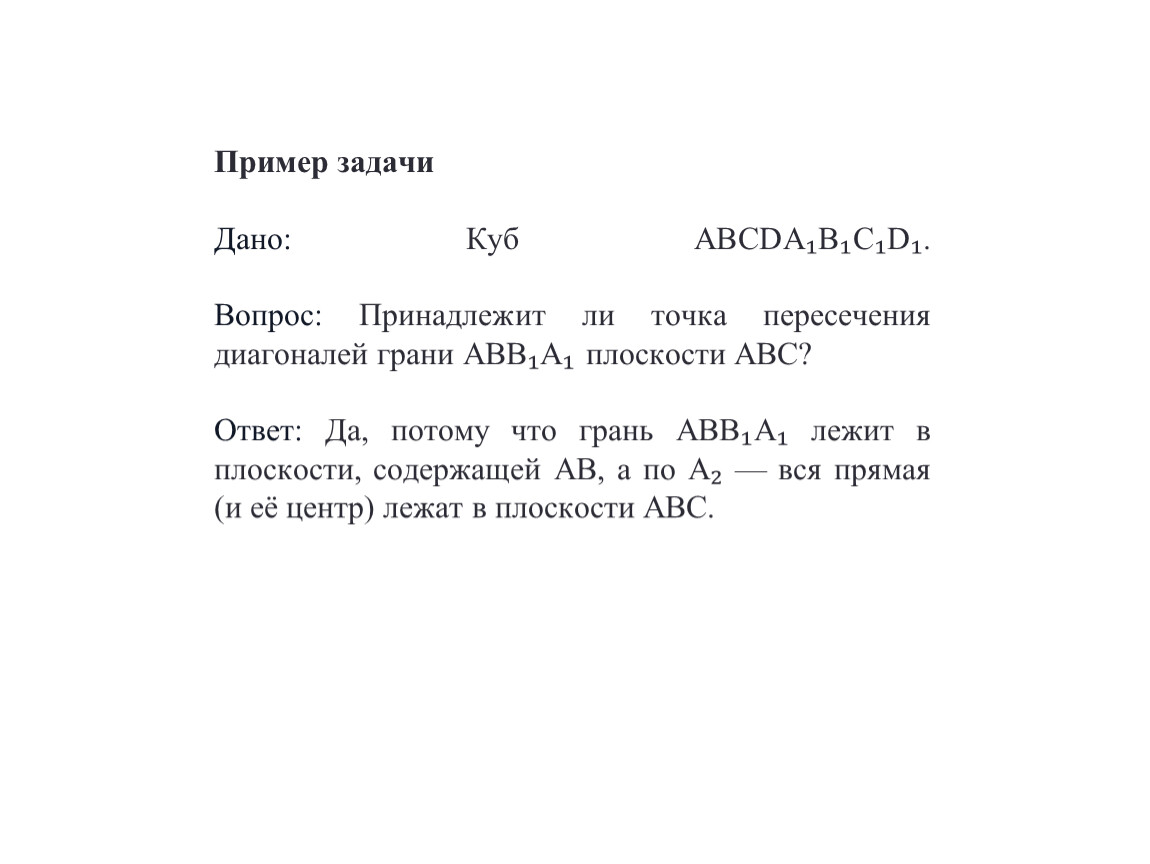 🔹🔹 Линейка на столеПоложите линейку на стол так, чтобы два её края (две точки) касались стола. Вся линейка ляжет плашмя — потому что если две точки прямой (линейки) лежат в плоскости (стола), то и вся прямая (линейка) лежит в ней.