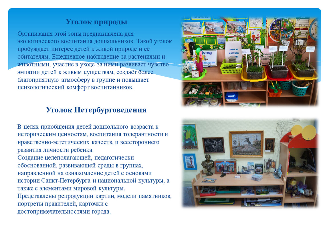 Создание целеполагающей, педагогически обоснованной, развивающей среды в группах, направленной на ознакомление детей с основами истории Санкт-Петербурга и национальной культуры, а также с элементами мировой культуры.