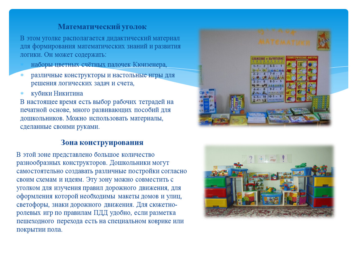 В этом уголке располагается дидактический материал для формирования математических знаний и развития логики. Он может содержать: