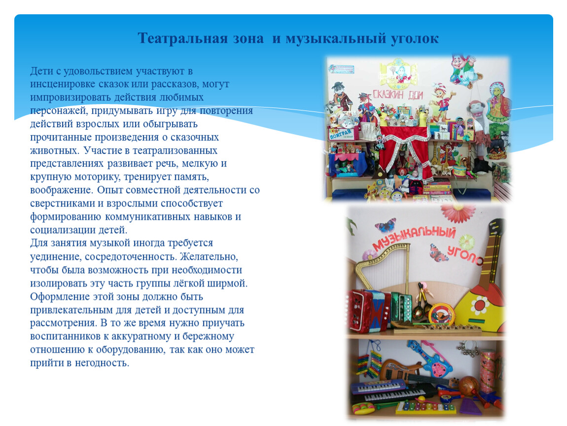 Для занятия музыкой иногда требуется уединение, сосредоточенность. Желательно, чтобы была возможность при необходимости изолировать эту часть группы лёгкой ширмой. Оформление этой зоны должно быть привлекательным для детей и доступным для рассмотрения. В то же время нужно приучать воспитанников к аккуратному и бережному отношению к оборудованию, так как оно может прийти в негодность.