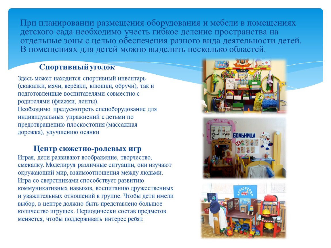 При планировании размещения оборудования и мебели в помещениях детского сада необходимо учесть гибкое деление пространства на отдельные зоны с целью обеспечения разного вида деятельности детей. В помещениях для детей можно выделить несколько областей.