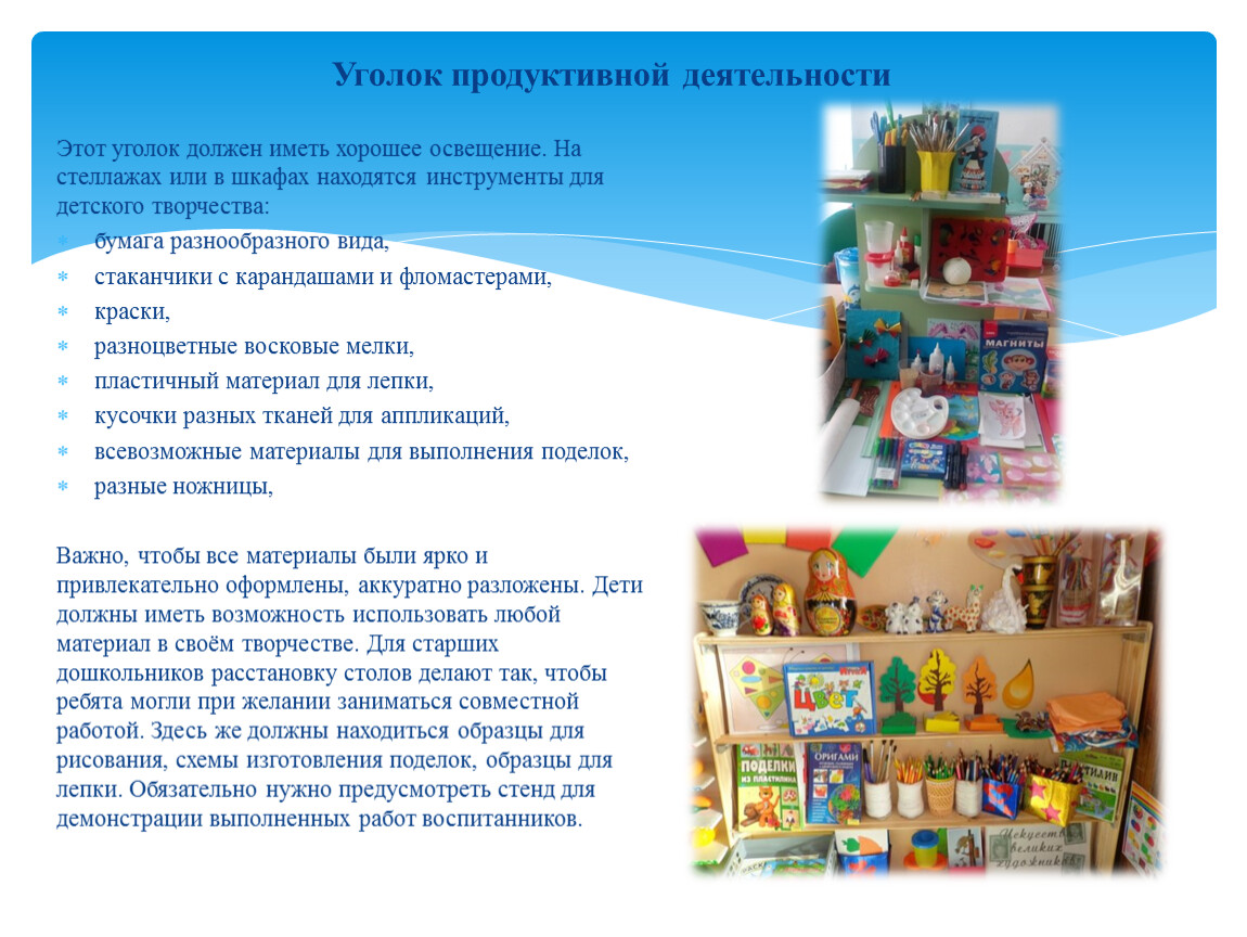 Важно, чтобы все материалы были ярко и привлекательно оформлены, аккуратно разложены. Дети должны иметь возможность использовать любой материал в своём творчестве. Для старших дошкольников расстановку столов делают так, чтобы ребята могли при желании заниматься совместной работой. Здесь же должны находиться образцы для рисования, схемы изготовления поделок, образцы для лепки. Обязательно нужно предусмотреть стенд для демонстрации выполненных работ воспитанников.