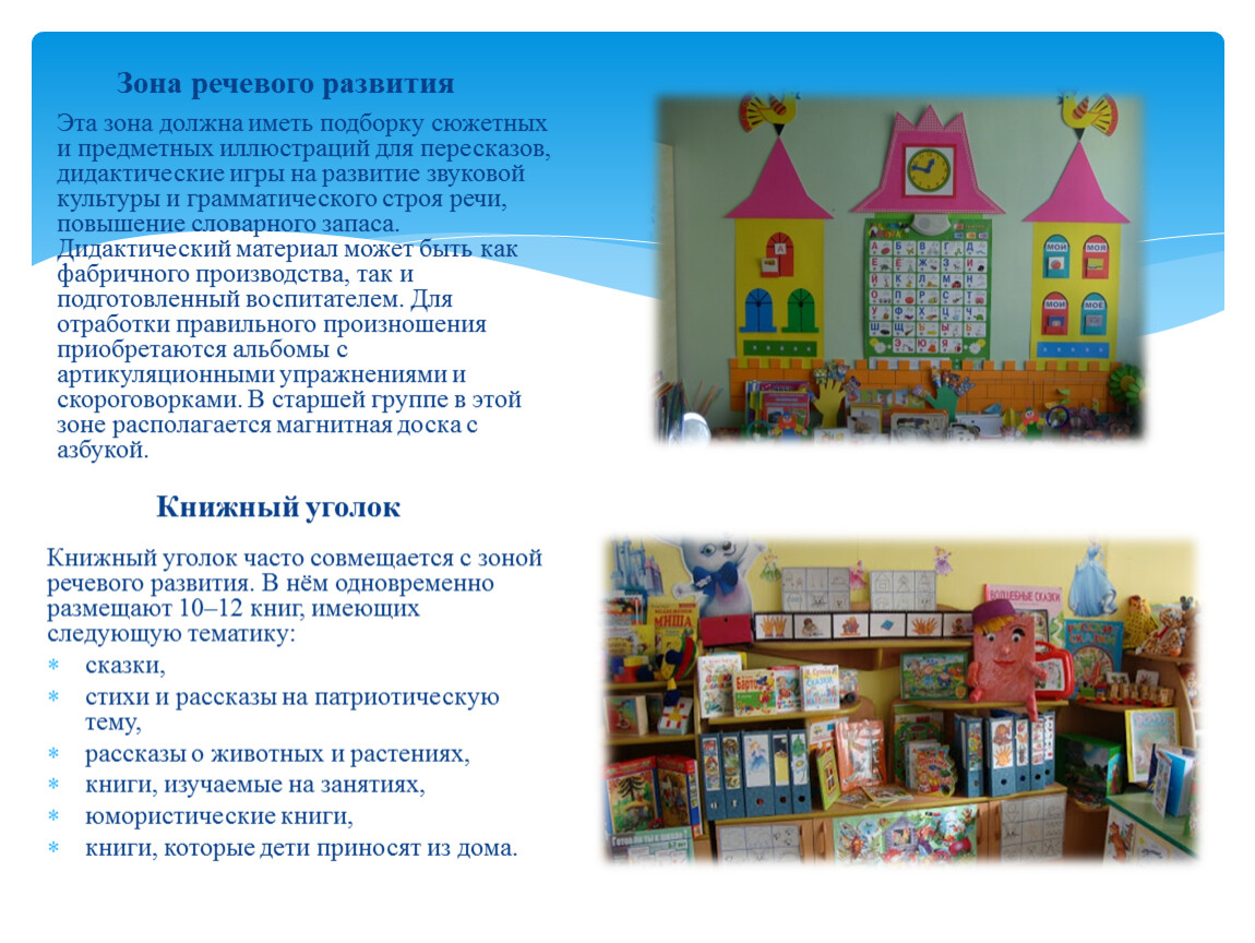 Эта зона должна иметь подборку сюжетных и предметных иллюстраций для пересказов, дидактические игры на развитие звуковой культуры и грамматического строя речи, повышение словарного запаса. Дидактический материал может быть как фабричного производства, так и подготовленный воспитателем. Для отработки правильного произношения приобретаются альбомы с артикуляционными упражнениями и скороговорками. В старшей группе в этой зоне располагается магнитная доска с азбукой.