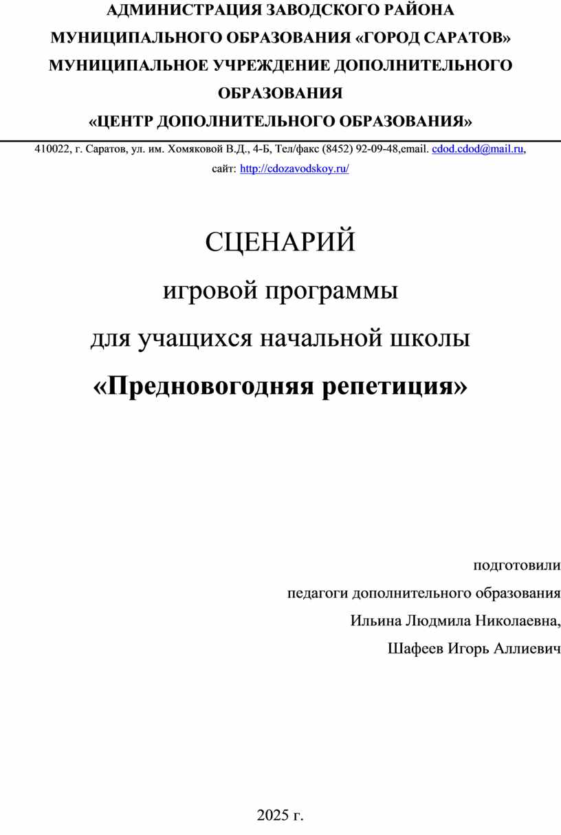 410022, г. Саратов, ул. им. Хомяковой В.Д., 4-Б, Тел/факс (8452) 92-09-48,email. cdod.cdod@mail.ru,